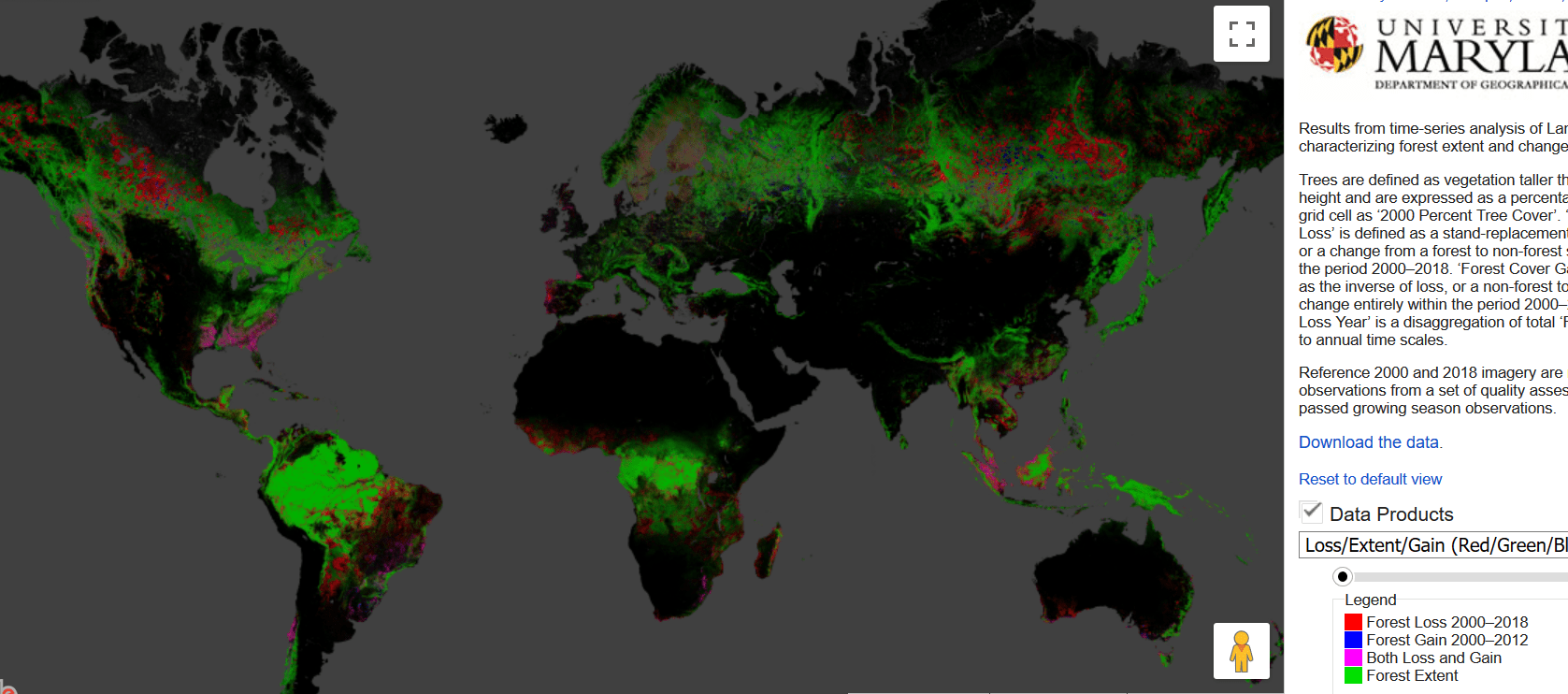 Hansen, M. C., P. V. Potapov, R. Moore, M. Hancher, S. A. Turubanova, A. Tyukavina, D. Thau, S. V. Stehman, S. J. Goetz, T. R. Loveland, A. Kommareddy, A. Egorov, L. Chini, C. O. Justice, and J. R. G. Townshend. 2013. High-Resolution Global Maps of 21st-Century Forest Cover Change. Science 342 (15 November): 850–53.