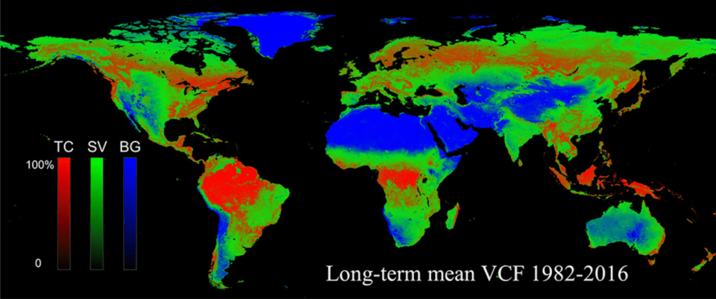 Vegetation continuous fields (VCF) represent land surface as a fractional combination of vegetation functional types that can be remotely sensed from satellites. The maps were obtained from NOAA/AVHRR satellite and consist of tree canopy (TC) cover, short vegetation (SV) cover and bare ground (BG) cover over the past 35 years (1982-2016).